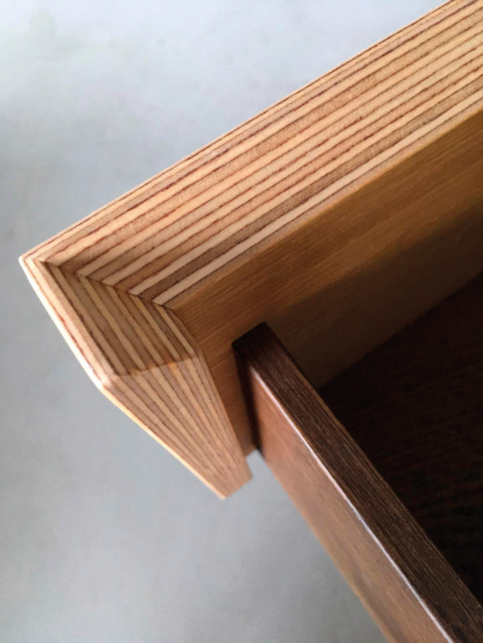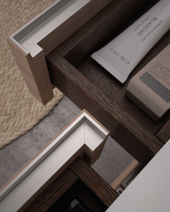 Les tiroirs à onglet sont disponibles en trois versions : poignée biseautée pour les laques, poignée en métal pour les finitions en stratifié et poignée biseautée en planche marine pour les façades de meubles avec finitions plaquées marron.